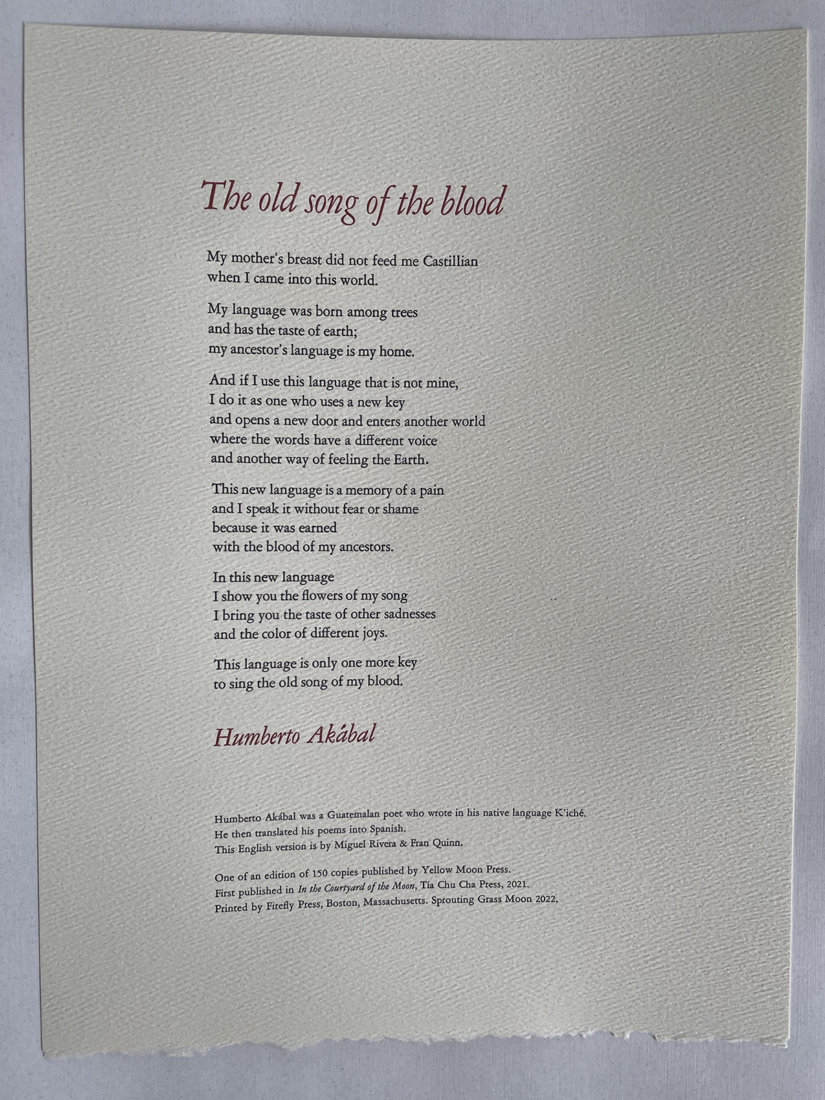 “Old song of the blood text”One of an edition of 150 copies published by Yellow Moon Press. Printed by Firefly Press, Boston, Massachusetts. Sprouting Grass Moon 2022.