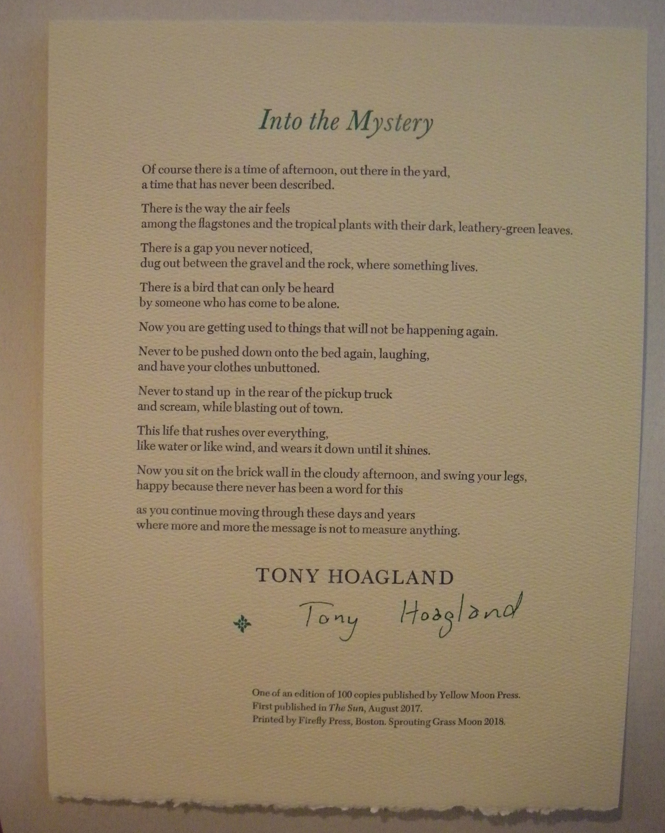 “Into the Mystery” - (Signed)By Tony Hoagland (1953 - 2018) A broadside in a set of 100 copies. Included in The Best American Poetry 2018. Published in The Sun 2017. |